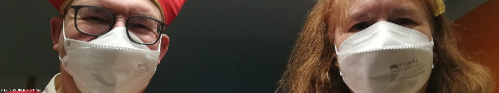 Mit einer groß angelegten Verteilaktion für alle Mitarbeiter*innen der Kopfkliniken bedrohen zwei maskierte Kostümierte in der Nikolauswoche die schlanke Linie: Kathrin Eunicke und Andreas Mauser, die beiden Klinikseelsorger der Kopfkliniken, ziehen als Nikolaus und Adventsengel durch die Zimmer und Gänge der Kopfklinik und verteilen Schokoladennikoläuse. Für die Mitarbeiter*innen aller Berufsgruppen verbinden sie es mit einem "Vergelt's Gott!" für alle Arbeit zu Gunsten kranker Menschen und ihrer Angehörigen. Eine ganze Woche lang sind die beiden unterwegs, bis sie auch den letzten der 1.800 Schokoladennikoläuse verteilt haben.